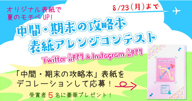 「中間・期末の攻略本」のカバーを外した中の表紙を、ペンやマスキングテープ等を使って自由にデコレーションし、TwitterまたはInstagramにタグ付きで投稿。