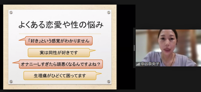 この特別動画授業は、ウェブサイトやセミナーなどを通じて性教育の情報を発信する「命育(https://meiiku.com/)」に出張講演を依頼。7月5日~8日の間に同一内容を計6回オンラインアプリ「Zoom」にて配信し、多数の在校生が講義を視聴いたしました。