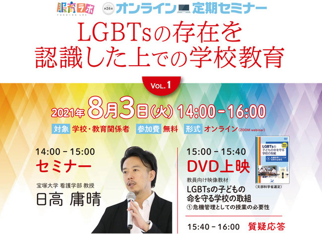 今年はLGBTs(エル・ジー・ビー・ティーズ)に関する研究や教職員向け資料作成などに多数関わられている、宝塚大学看護学部の日高庸晴教授を講師にお迎えし、「LGBTsの存在を認識した上での学校教育」と題したセミナーを開催予定です。