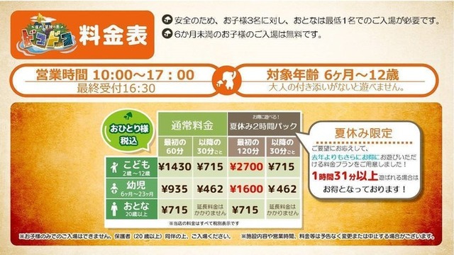 販売内容:1時間半以上遊ぶと通常料金よりもお得な2時間パックを夏休み限定で販売します。