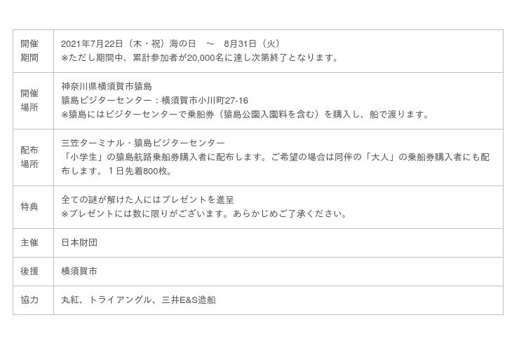 日本財団(東京都港区、会長 笹川陽平)は、無人運航船の実用化を目指す『MEGURI2040プロジェクト』の一環として、海の日である7月22日(木)より、横須賀市・猿島にて小学生を対象に『猿島謎解きMAP』を配布いたします。