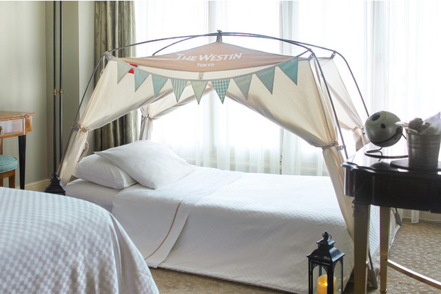 客室内に、ガーラントが可愛らしいウェスティンホテル東京オリジナルテント付きのキッズキャンピングベッド(95cm×190cm)を設置します。