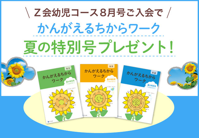 ※『かんがえるちからワーク 夏の特別号』は、幼児コース8月号から初めてお申し込みいただいた方にのみ、8月号教材同封でお届けします。