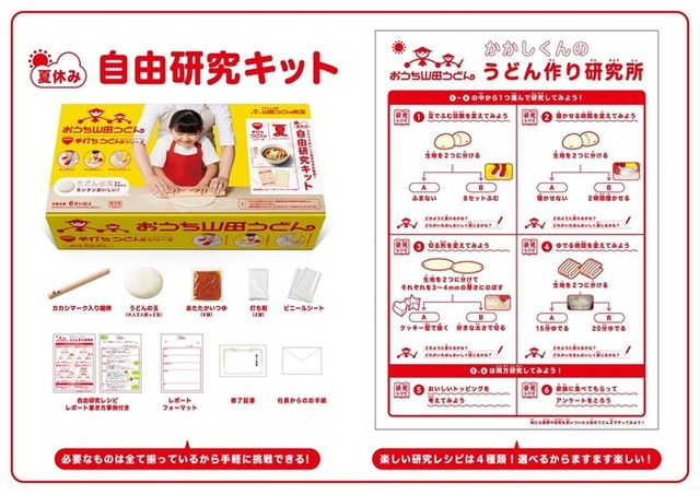 この度登場する「自由研究キット」は、手打ちうどんキットの素うどんのキットに、4種類の自由研究レシピと研究結果を書き込めるレポートフォーマットを同梱。「うどんを作る過程で重要な4つの工程を変えると、うどんの味はどの様に変化するのか」というテーマについて、楽しく研究をすることができます。また、研究レシピごとにレポートの書き方事例もご用意することで、お子様が自由研究のポイントを簡単に理解できるようにいたしました。作る工程はもちろんトッピングも工夫したりと、今年の夏は親子でよりおいしいうどんの作り方を研究してみてはいかがでしょうか。