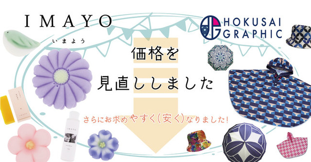 和傘・和柄傘レイングッズ専門店「北斎グラフィック」、無添加の和石鹸専門店「IMAYO」は、当社が運営する専門店の中でも特に日常に取り入れやすい和物であり、品質にこだわり完成度の高い商品を提供しています。今回、毎日の暮らしに“和”を取り入れ“和”のある暮らしを楽しんでいただくために、和傘や無添加和石鹸の価格見直しを行い、こだわりのある和物を手に届きやすいお値段で提供することを決めました。