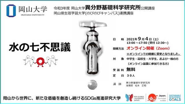 国立大学法人岡山大学(本部:岡山市北区、学長:槇野博史)の異分野基礎科学研究所では、岡山県生涯学習大学(のびのびキャンパス)連携講座として、公開講座「水の七不思議」をオンライン開催することになりました。