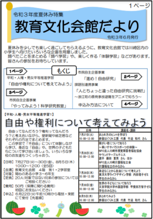 その中で【平和・人権・男女平等推進学習1】「自由や権利について考えてみよう」という連続講座が、7月27日(火)~30日(金)、8月5日(木)の全5回実施され、参加する小学生には、「不自由」や「自由」、世界の子どもたちについて体験を通じて学び合い、最後にそれを表現する機会となっています。