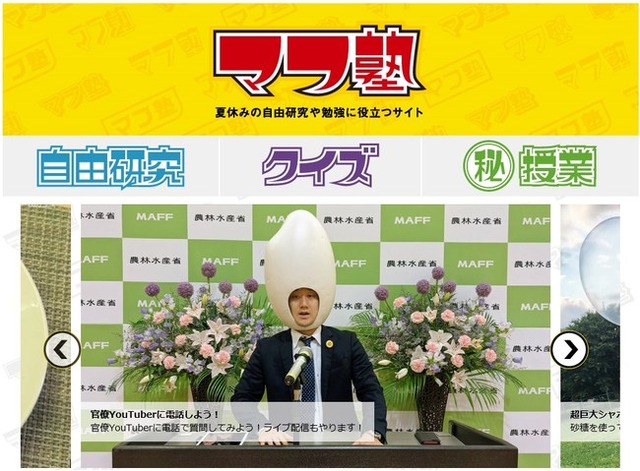 農林水産省は、令和3年度「こども霞が関見学デー」の一環として、夏休みの自由研究にも役立つ27のオンラインプログラムを掲載した特設Webサイト「マフ塾」を本日よりオープンします。