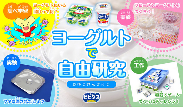 ▲森永乳業とコラボした「ヨーグルトで自由研究」。同社のビヒダスヨーグルトを活用して取り組める4つのテーマを紹介しています。