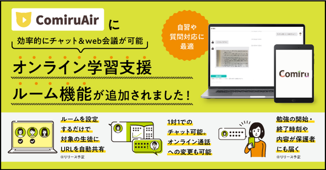 今回「ComiruAir」に搭載した「オンライン学習支援ルーム機能」も、このミッションを実現するための新機能となります。開発に至ったきっかけは、新型コロナウイルスによる休校期間にも「学びを止めない」ためにComiruの既存機能を活用しながら生徒と向き合っていた学習塾様がいらっしゃったことです。通塾ができなくても、授業という形ではなくても、生徒が自宅で勉強できる空間を提供しようとする学習塾様の姿勢を見て、それを支援できるように開発したのが「オンライン学習支援ルーム機能」です。
