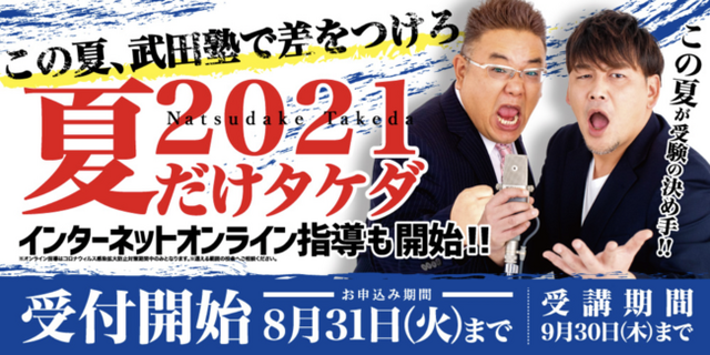 学習塾「武田塾」を全国に展開している株式会社A.ver(代表取締役:林尚弘、本社:東京都文京区 以下「武田塾」)は、毎年恒例となっている夏期講習を「夏だけタケダ2021」として開講することをお知らせいたします。
