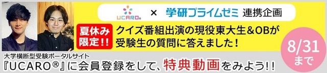 『ここで差をつけろ!夏のやる気応援キャンペーン』では、キャンペーン期間中、難関大対策映像講座『学研プライムゼミ』と大学横断型受験ポータルサイト『UCARO(R)』の両方で会員登録して「ID連携」をされた方に特典動画を無料配信いたします。特典動画では、クイズ番組出演の現役東大生&東大卒会社経営者が出演し、高校生からの勉強や進学に関する数々の質問にお答えします。