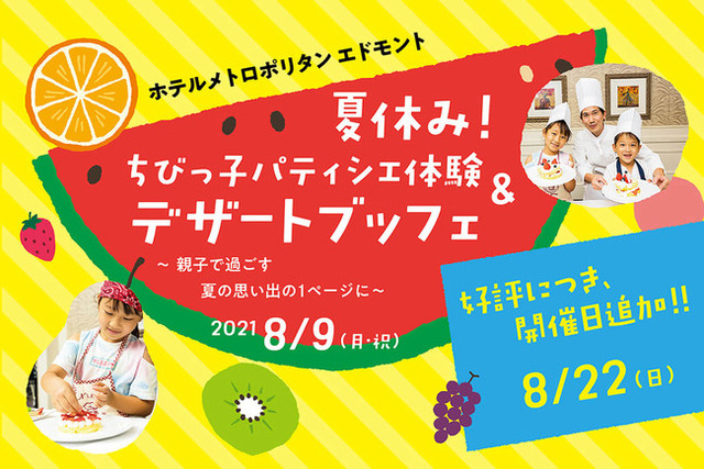 【2021年7月】東京 --- ホテルメトロポリタン エドモント(所在地/千代田区飯田橋、総支配人/松田秀明)では、8月9日(月・祝)に開催を予定している「夏休み!ちびっ子パティシエ体験&デザートブッフェ」の参加希望が多く寄せられたことを受け、8月22日(日)に追加開催を決定しました。