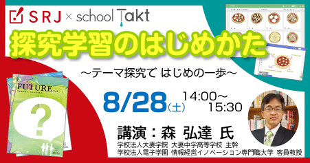 そのような状況を鑑み、SRJとコードタクトでは、探究学習のはじめの一歩を応援するべく、探究学習型アクティブラーニング教材『FUTURE』の著者であり、中高一貫校でその実践を進めている森弘達氏を講師に迎えたオンラインセミナーを8月28日(土)に開催します。