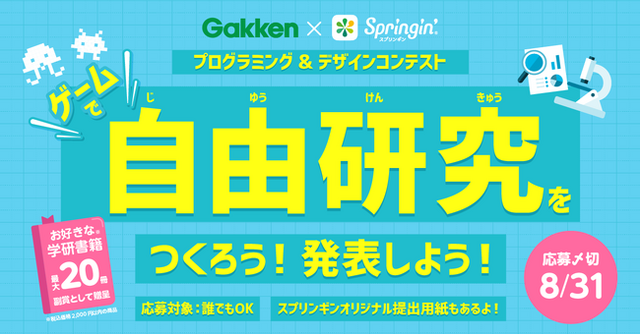 株式会社しくみデザイン(本社:福岡市博多区、代表取締役:中村俊介、以下「しくみデザイン」)と株式会社学研ホールディングス(本社:東京都品川区、代表取締役社長:宮原博昭、以下「学研」)は、しくみデザインが自社で開発するプログラミング未経験でもゲームがつくれる創造的プログラミングアプリ「Springin’(スプリンギン)」を使って「自由研究」をテーマにしたプログラミング&デザインコンテストを7月26日(月)より開催します。さらに、8月2日(月)~8月27日(金)の期間には、スプリンギンを使った作品づくりを学べる無料オンラインワークショップを開催します。