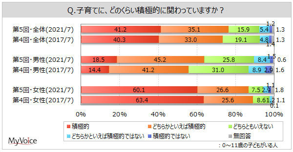 11歳以下の子供がいる人に、子育てへの関与度を聞きました。子育てに積極的に関わっている人は、「積極的」「どちらかといえば積極的」を合わせて8割弱です。男性は6割強、2017年調査と比べて増加しています。女性は9割弱です。