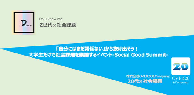 20代×社会課題をテーマに事業を展開する株式会社OVER20&Company.(東京都港区 / 代表 石堂里佳)は、Z世代×社会課題をコンセプトに活動する学生団体Do u know me(代表 西村海都)と新たにパートナーシップを結び、学生が社会課題について自分ごととして考えるための全7回にわたるセミナー「『自分にはまだ関係ない』から抜け出そう!大学生が社会課題を議論するイベント-Social Good Summit-」を21年8月23日(月)18:00~19:30から順次開催し、本日より募集を開始します。