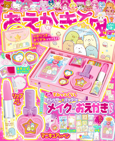 9月号の付録は「すみっコぐらし ドレッサー★バッグつき メイクきぶんおえかきセット」。バッグを開けて、組み立てると、ドレッサーのようなケースになります。中には、本物のおけしょう道具みたいなペンやメモがたっぷり。コスメふうのアイテムがとってもかわいいおえかきセットです。人気のスタンプや、メモが入る封筒、切手ふうのシール等も入っていて、とっても豪華!