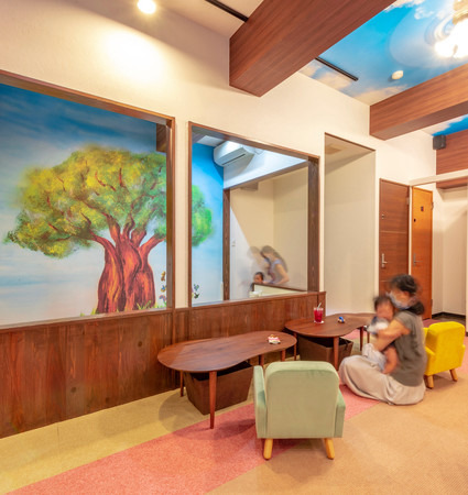 そのような方々に安心して利用できる食事·空間を提供するため、広いキッズスペースとおむつ交換台·ベビーベッドを備え、靴を脱いで親子で過ごせる店内全体に除菌コートを施しています。
