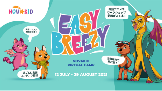 世界中の4歳から12歳の子ども向けにオンライン英語教育サービスを提供するEdTechスタートアップのノバキッド(本社:アメリカ・サンフランシスコ)は、英語の無料レッスン動画を毎週提供するオンラインキャンプ「Easy Breezy(イージー・ブリージー)」を8月29日(日)まで開催しています。子どもたちをわくわくさせる英語レッスンや工作ワークショップ、世界の名作アニメーションなど、楽しみながら英語を上達させるための動画が多数用意されています。