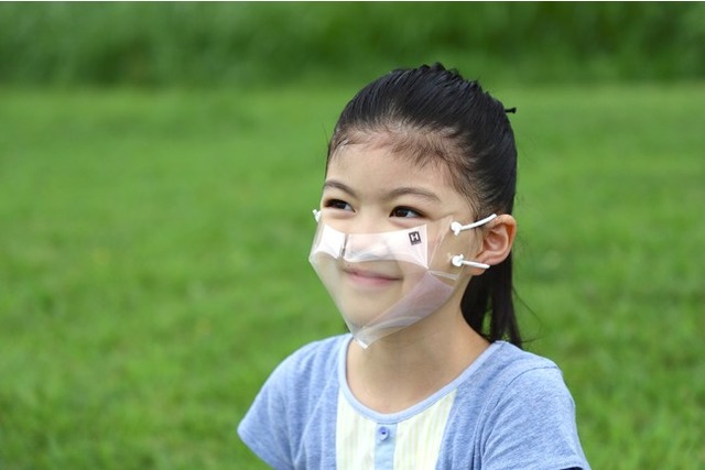 通常の不織布マスクや布マスクでは気が付くことのできない子供の顔色、唇の色、表情の変化などに気がつけるよう、透明タイプのマスクも開発しました。