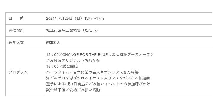 CHANGE FOR THE BLUEしまね実行委員会は、7月25日(日)に松江市営陸上競技場で開催された「松江シティFC vs ソニー仙台FC」の試合会場で、海の環境保全の意識向上を目的としたごみ拾い促進イベントを実施しました。また8月1日(日)には、松江シティFCと連携した松江市古浦海水浴場のごみ拾いを実施し、選手やスタッフとサポーター、約90人が一緒に海岸清掃を行いました。