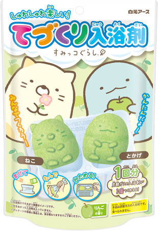 今回、もっと親子のコミュニケーションの時間を増やしていただくため、人気のキャラクター『すみっコぐらし』デザインを起用した限定企画品を発売いたします。かわいい『すみっコぐらし』のキャラクター 『ねこ』と『とかげ』の形の炭酸ガスの入浴剤が簡単に作れます。みどり色のお湯に、お子様に人気のりんごの香りです。白元アースは、親子の大切なコミュニケーションの場である“バスタイム”をもっと楽しくしていきます。