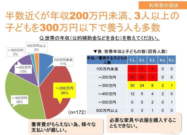 相対的貧困率が48.3%(2019年国民生活基礎調査)といわれるひとり親家庭の「住」について、「グッドごはん」利用者を対象に住宅事情の調査を実施したところ、住居の不安定さ・不便さにより子育てや就業がさらに難しくなっている状況が見えてきました。