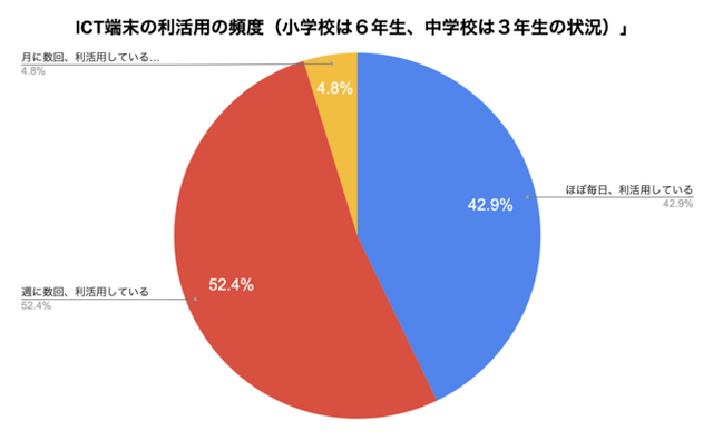 また、高梁市教育委員会が市内の小学校・中学校全校にアンケート調査を実施したところ、GIGA端末を「ほぼ毎日利用している」は42.9%、週に数回利用しているは「52.4%」となり「ほぼ毎日利用している」「週に数回利用している」を合わせて95.3%となった。(小学校は6年生、中学校は3年生の利用状況)