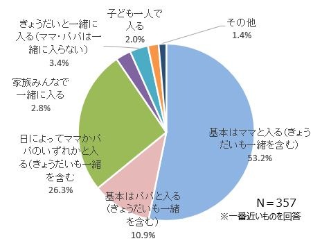 子どもが「誰とお風呂に入るか」を聞いたところ、「ママ(きょうだいも一緒を含む)」が53.2%と最も多く、次いで、「日によってママかパパのいずれかと入る」(26.3%)となりました。夕食作りや片付けなど家事にも忙しい中、子どもをお風呂に入れる忙しいママの様子がうかがえます。入っている時間は「15分~20分程度」と、「10分~15分程度」が僅差で多数となりました。子どもがお風呂を好きかという質問には、「とても好き」「まあまあ好き」が合わせて約9割。また最近増えてきている子ども用のシャンプーやボディーソープについては、シャンプーは55.5%、ボディーソープは40.9%が使っているとの回答でした。