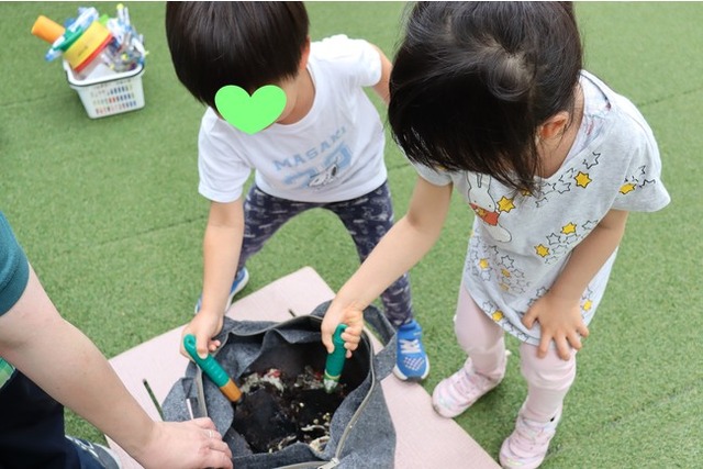 明日葉保育園大倉山園では、食品ロスの削減のため、「コンポスト」を始めました。給食の残菜が栄養たっぷりのたい肥に変わることを目指し、7月5日から毎日、園児たち自らコンポストに取り組んでいます。