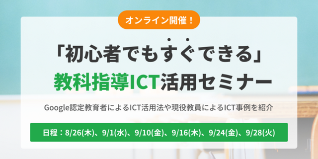 本セミナーでは、Google認定教育者の資格を取得したICT実践専門講師による「初心者向けのICT活用方法」と、現場でICT活用を実践する現役教師をゲストに迎えた「活用事例のご紹介」を行います。生徒に配布された1人1台端末の活用方法を模索中の先生、端末配布を前に情報収集中の先生など、皆様にとってお役に立てる内容になっておりますので、是非ご参加ください。