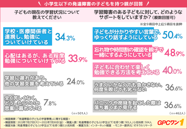 そこで今回、子どもの成長期サプリ『GPCワン』(https://bit.ly/3CEpZoi)を販売する株式会社クラウディア(https://www.claudia.co.jp)は、発達障害の子ども(小学生以下)を持つ親御さんと小児科医を対象に、「発達障害の子どもの学習事情」に関する調査を実施しました。