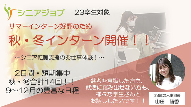 50歳以上のシニア人材に特化した人材紹介と人材派遣を提供する(株)シニアジョブ(本社:東京都新宿区/代表取締役 中島康恵/以下、シニアジョブ)は、2023年卒業見込みの大学生を対象としたインターンシップを延長し、秋冬インターンシップを開催することを発表しました。