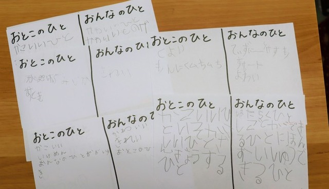 まず、子どもたちには「おとこのひと」「おんなのひと」と聞いて何をイメージするか、紙の左側に男の人、右側に女の人のイメージを書いてもらいました。子どもたちからは「男の人は、ムキムキ・かっこいい・仮面ライダー」「女の人は、かわいい・ピンク・プリキュア」などの性別に対する固定的なイメージが出てきました。