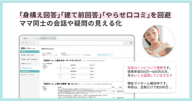 コネヒト株式会社(本社:東京都港区、代表取締役社長 北吉 竜也、以下「コネヒト」)は、ママの3人に1人(※1)が利用するアプリ「ママリ」内の検索/Q&Aデータを法人向けに分析して提供する「家族ノート」内で、高度なテキストマイニング技術を用いてママ同士の相談内容の分析結果を提供する機能を公開しました。これにより、一般的な市場調査では見極めが必要とされている「身構え」「建て前」による表層的な回答を回避でき、且つ調査結果の集計時間や分析時間の大幅削減が両立できるようになりました。