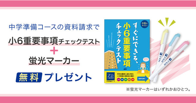 株式会社増進会ホールディングス(Z会グループ)のグループ会社である株式会社Z会は、2021年11月リニューアル開講予定の「Z会の通信教育 中学準備コース」の資料請求受付を8月2日より開始しました。中学準備コースの資料をご請求いただいた方に、『すぐにできる、小6重要事項チェックテスト』『蛍光マーカー』を無料でお届けします。
