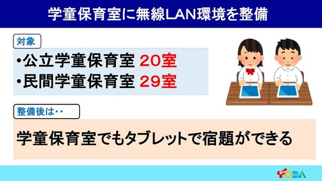埼玉県戸田市では、小学校の教育現場へのタブレットパソコン導入に伴い、公立学童保育室及び民間学童保育室においても、児童がタブレットパソコンで宿題などの学習をスムーズに行えるよう、無線LANのインターネット環境の構築を実施します。