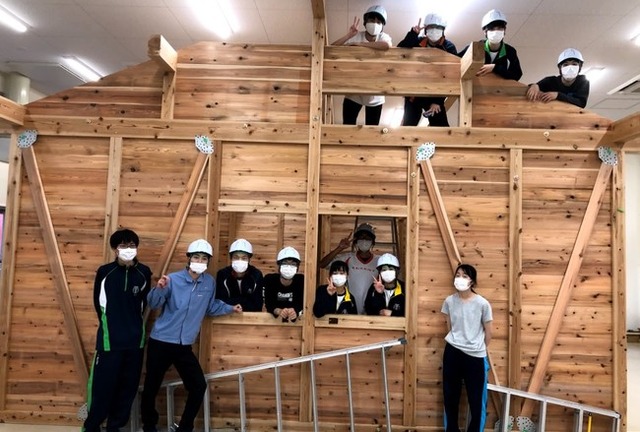 現在、阿南高専本科5年生らが中心となり、卒業研究の一環として、既存の木造仮設住宅の工期を短縮し、材料の無駄をなくすよう教員や建設会社の指導を受けながら、新しい徳島型の木造仮設住宅を設計し、工事に用いる木材をプレカット工場で加工しています。