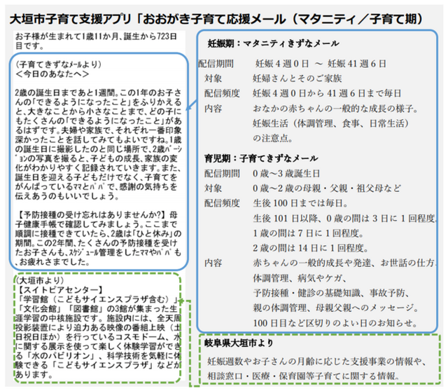 これらを踏まえ、幼い子どもを育てる親や出産を迎える妊婦などの不安や孤独感を軽減し、安心して出産や子育てができるよう、子育て支援アプリの機能を拡充し、「おおがき子育て応援メール」を導入しました。