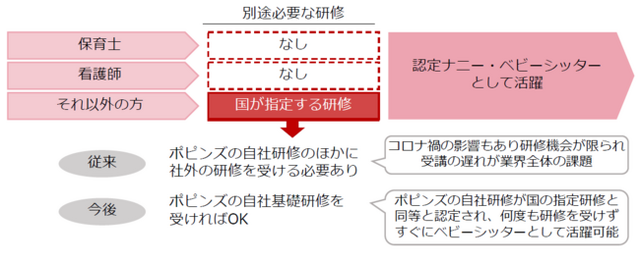 本認定によりポピンズでは、自社の提供するベビーシッター育成研修を以って、保育士や看護師等の資格を持たない方も、いちはやく認定のナニー・ベビーシッターとして活躍いただけるようになります。
