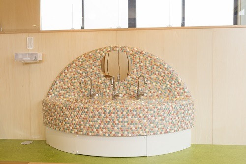 手を洗うためだけでなく、冷たい水の感覚に触れ、子どもたちの行動を切り替えるための大切な場所として作られました。子どもたちにとっても大切な場所であるという目印になるよう、一つひとつ形や色の違うタイルを、職人の手で丁寧に貼り付けて作りました。