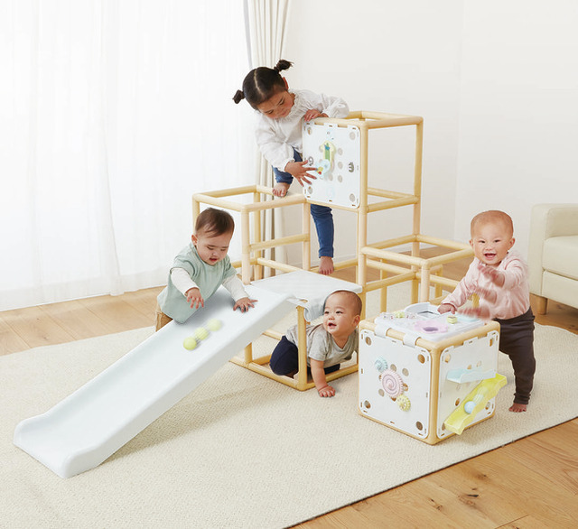 0歳6か月~6歳ごろまで、お子様の成長やお部屋のレイアウトなどに合わせて4つの作例に組み替えが可能。いつでも最適な運動遊びができるので、安全にお使いいただけます。
