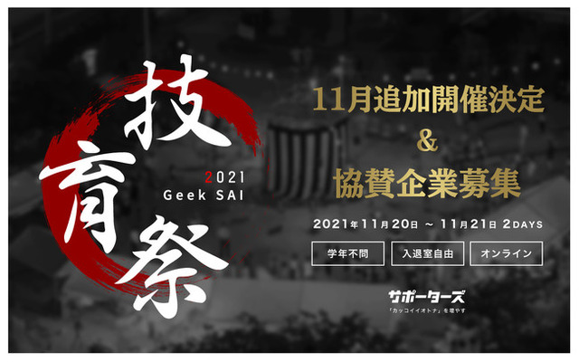 株式会社サポーターズ(東京都渋谷区、代表取締役:楓 博光)は、国内最大級のエンジニア学生向けテックカンファレンス「技育祭」を11月20日から2日間にかけて、オンラインにて追加開催いたします。エンジニア学生2,000-3,000名が参加し、協賛企業は一斉にエンジニア学生に対して知名度を拡大することが可能です。