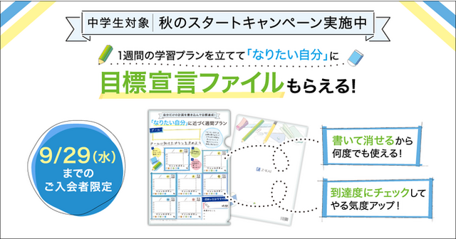株式会社増進会ホールディングス(Z会グループ)のグループ会社である株式会社Z会は、「Z会の通信教育」中学生向けコースにおいて、中学生を対象にした「秋のスタートキャンペーン」を実施しています。苦手分野の挽回対策にも役立つ「巻き返し!目標宣言ファイル」をプレゼント。一年の折返しである秋に、学習スタイルを見直しませんか?