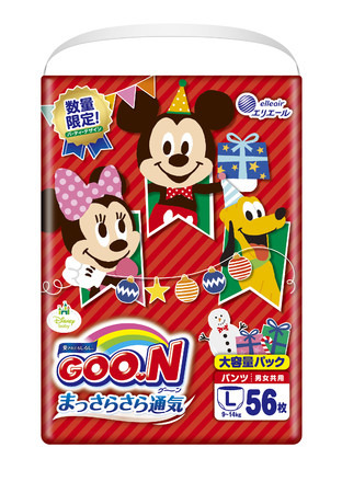 ディズニーキャラクターがプレゼントボックスや煌びやかなオーナメントを手に、賑やかにパーティーを楽しむ様子を表現し、通常品では登場していなかったキャラクターも新たに登場するなど、おうち時間が増える中、さらにおむつ替えを楽しんでもらいたいという想いのもと、この『グーン まっさらさら通気』秋冬デザイン企画品を皆様にお届けします。