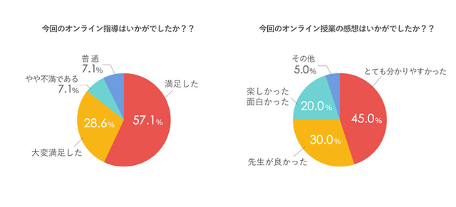 全体では、オンラインの個別指導に対しての満足度は、「とても満足・満足」が85.%となり、特に「初めてオンライン指導を受ける生徒様」が「2回目以降の生徒様」よりも、高い満足度となっている結果となりました。そして、「分かりやすかった」以外では、「先生が良かった」「楽しかった」という感想も多く寄せられました。