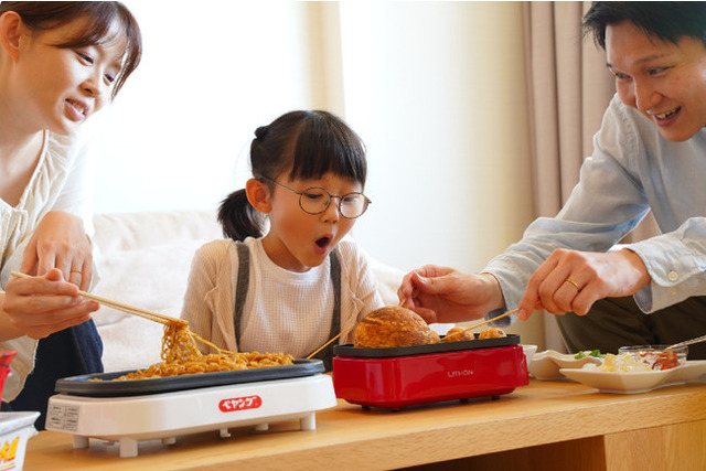 この宿泊プランでは「ギガたこ焼き器」「せんべろメーカー」「焼きペヤング」「回転寿司トレイン」「チーズフォンデュ」の5製品を客室にご用意。このほか、卓上燻製器、トースター、わたあめメーカー、ハンディクレープメーカーなど調理家電や流しそうめん器、イルミネーションスピーカー等もご希望に応じてお貸出いたします。