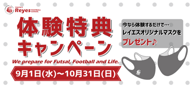 東急Sレイエス フットボールスクールでは、ご入会前のお子様が通常スクールに一度だけ無料体験できる制度がございます。今回は、新学期から新たにサッカーやフットサルを始めよう、また、もっと上達したい!と考えているお子様を対象に、体験者の皆様にオリジナルマスクをプレゼントいたします♪また、ご紹介いただいた会員の皆様にもプレゼントいたします♪皆様のご体験をお待ちしております。