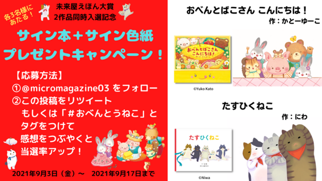 マイクロマガジン社(東京都中央区)は絵本『おべんとばこさん こんにちは!』と『たすひくねこ』が未来屋えほん大賞に2作品同時入選したことを記念し、サイン本とサイン色紙のプレゼントキャンペーンを開催いたします。